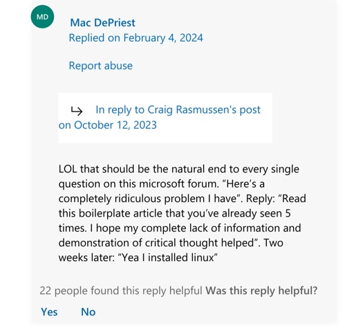 Why is Microsoft’s support so completely and utterly useless, anyway? Do they purposely hire people who don’t understand how computers work for their support team? They almost always reply with a “solution” that has absolutely nothing to do with the issue at hand. Why are they so bad at their jobs?