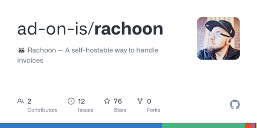 arrow-up124arrow-down1external-linkRachoon - Self-Hostable Invoicing made simplegithub.comad_on_is@lemmy.dbzer0.com to Open Source@lemmy.ml · 10 days agomessage-square1linkfedilink cross-posted to: selfhosted@lemmy.world