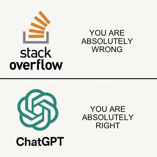 ☆ Yσɠƚԋσʂ ☆@lemmy.ml to Programmer Humor@lemmy.mlEnglish · 5 days agoStackOverflow vs ChatGPTlemmy.mlimagemessage-square8linkfedilinkarrow-up1172arrow-down10