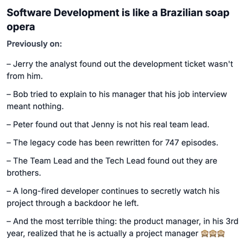 ☆ Yσɠƚԋσʂ ☆@lemmy.ml to Programmer Humor@lemmy.mlEnglish · 9 days agoSoftware Development is like a Brazilian soap operalemmy.mlimagemessage-square4linkfedilinkarrow-up177arrow-down13