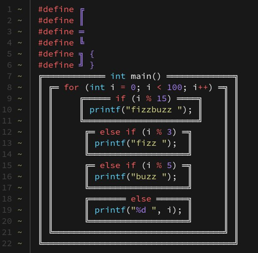 Ya’know, it shouldn’t be too hard to setup the ╔ and ╚ characters to function as or be substituted for quotes or brackets, depending on the language, then handle the rest as ligatures. Straight display substitution could allow for clean code and portable touch-typing, while still providing this sort of “visual training wheels” for those who want it in their own editor/ide