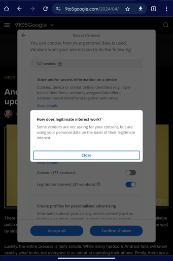I never consent to give my data away or being tracked, but how do you deal with so called legitimate interest? I tried several times to untick them but it is a long list (in fact at the bottom there is a “vendors” link with even longer, much longer list. It took me 10 minutes to get to the bottom of it once).