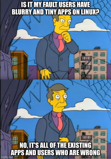 Bottom Skinner is right, though. It’s 2024. HiDPI has to be supported by all toolkits, desktops, and applications at this point. There are no excuses. Even 1080p on a 14" laptop screen warrants 125% scaling, IMO.